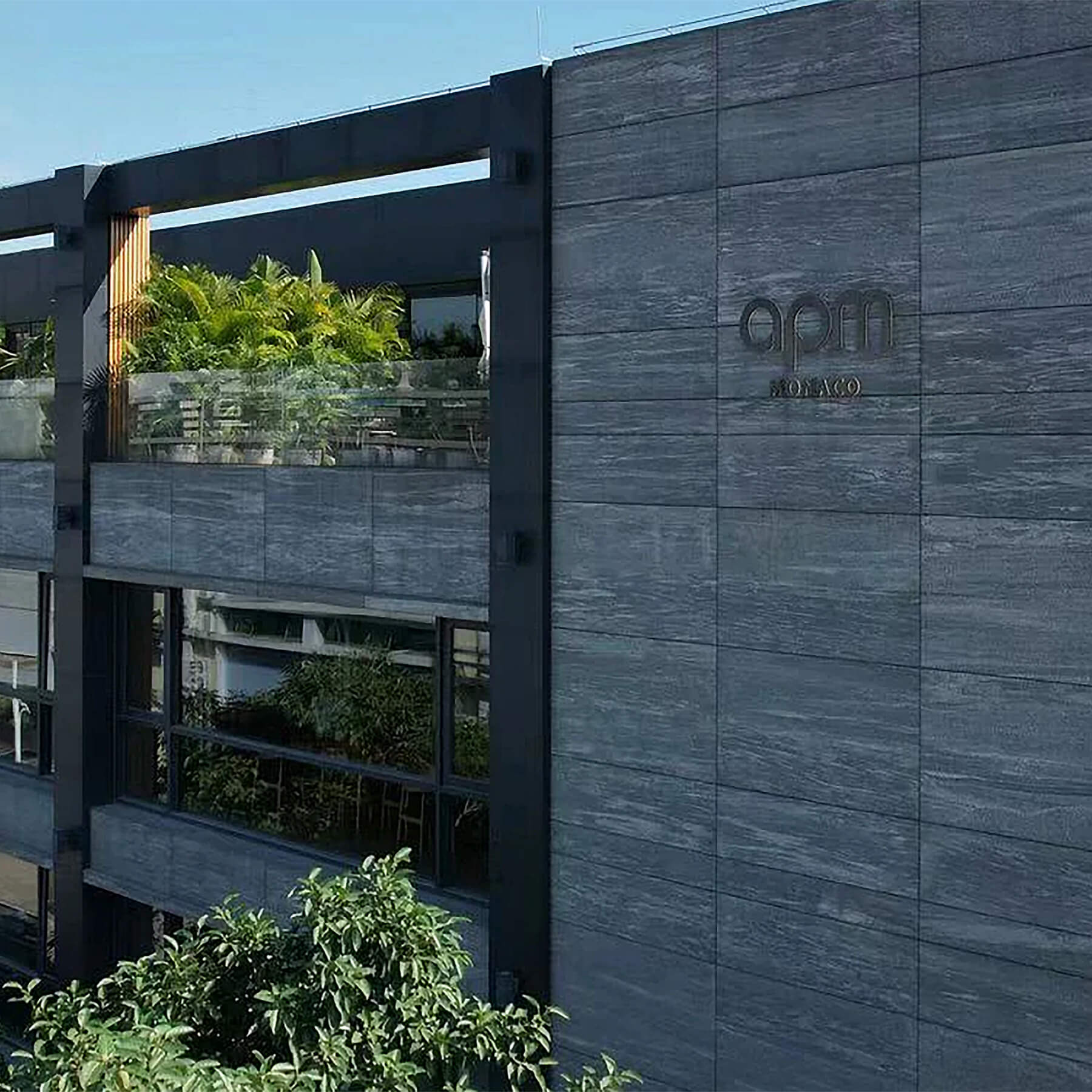 A grey and black tribal-inspired print with “APM MONACO” embroidered in bright forest green. Very Instagrammable.