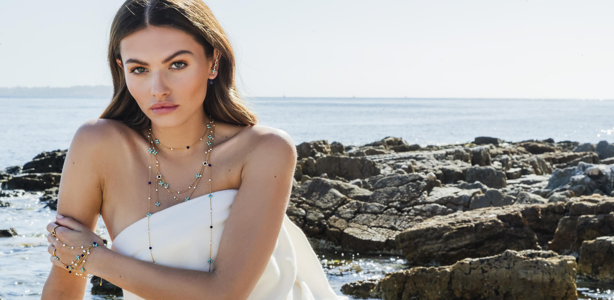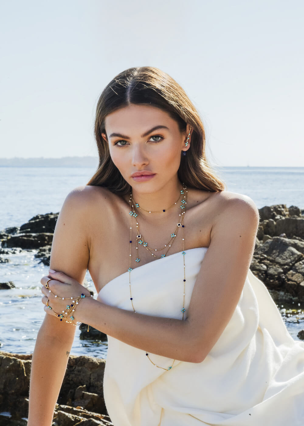 The turquoise Mediterranean, a signature of the South of France, was the backdrop of the campaign shoot of Collection Roma, mirroring the colorful stones and gems of the jewelry.