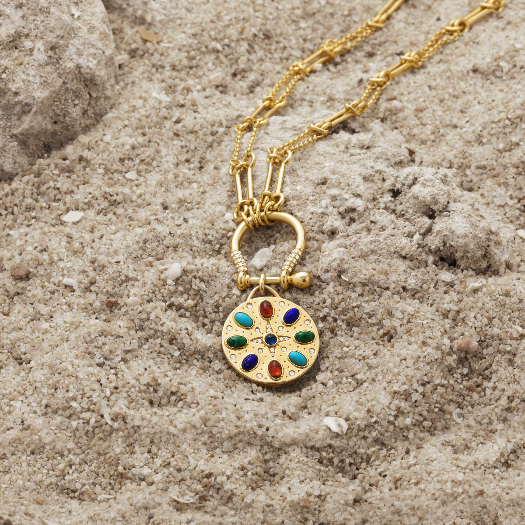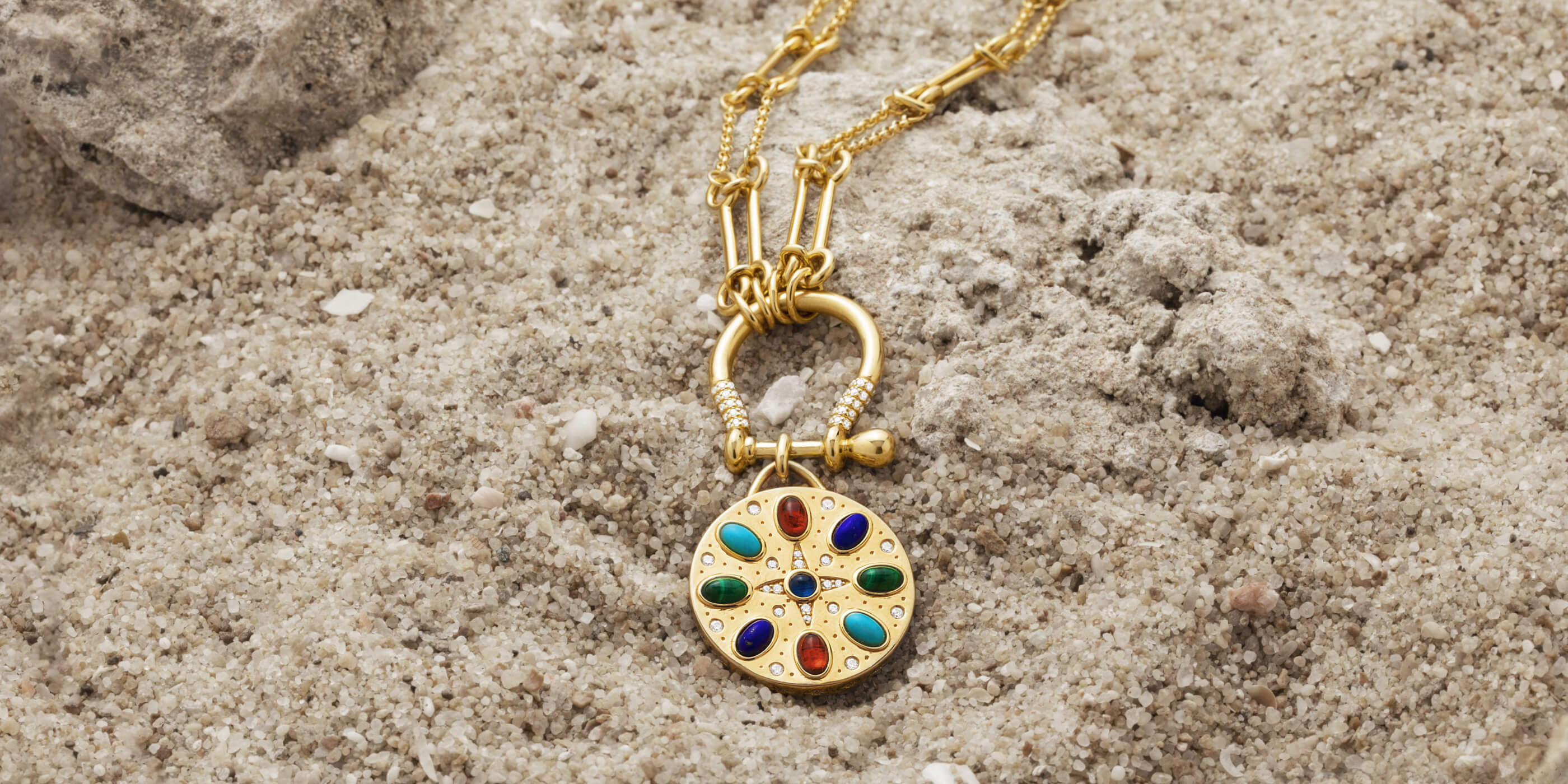 The collection features dainty and sturdy designs, and coloured gems. Gold bangles with multi-colored stones, coin pendants, inspired by the Roman era.